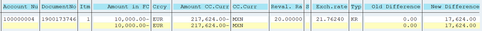 10000 EUR revalued @ 20 and difference posted and then reversed