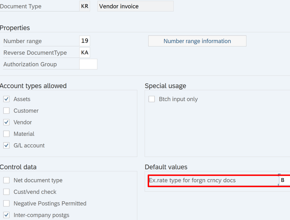 We can specify the exchange rate type to be used by a specific document type ( KR) in transaction code OBA7