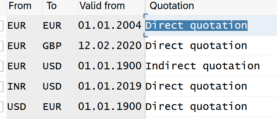 Path: SAP NetWeaver – General Settings – Currencies – Define Standard quotation for exchange rate