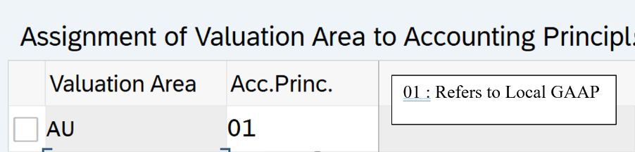 Path: SPRO- Financial Accounting (New) – General Ledger Accounting (New) – Periodic Processing- Assign valuation area to accounting principles