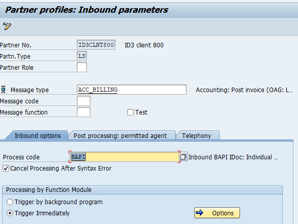 This has to be configured separately for different iDoc types. Here we will set it up for inbound iDoc type ACC_BILLING02 (Post Customer Invoice)