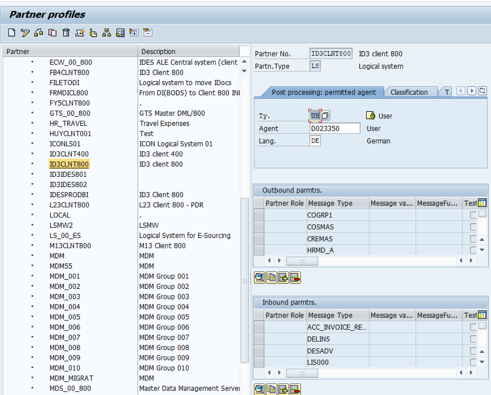 Select folder LS (Logical System) – Now click the create button. In the Partner Number field enter the receiving system created earlier. In the inbound Parameters click the plus sign and enter the below details: