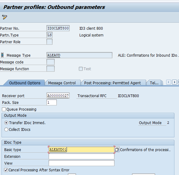 This has to be configured separately for different iDoc types. Here we will set it up for outbound iDoc type ALEAUD01 (Audit Confirmation)