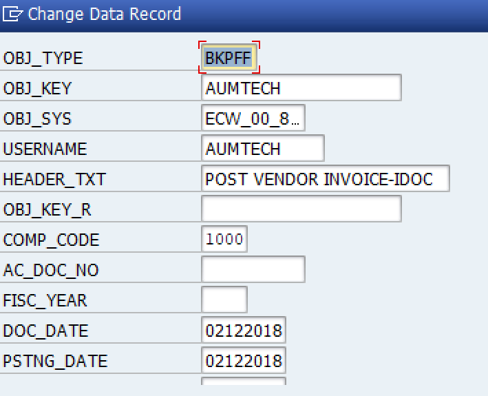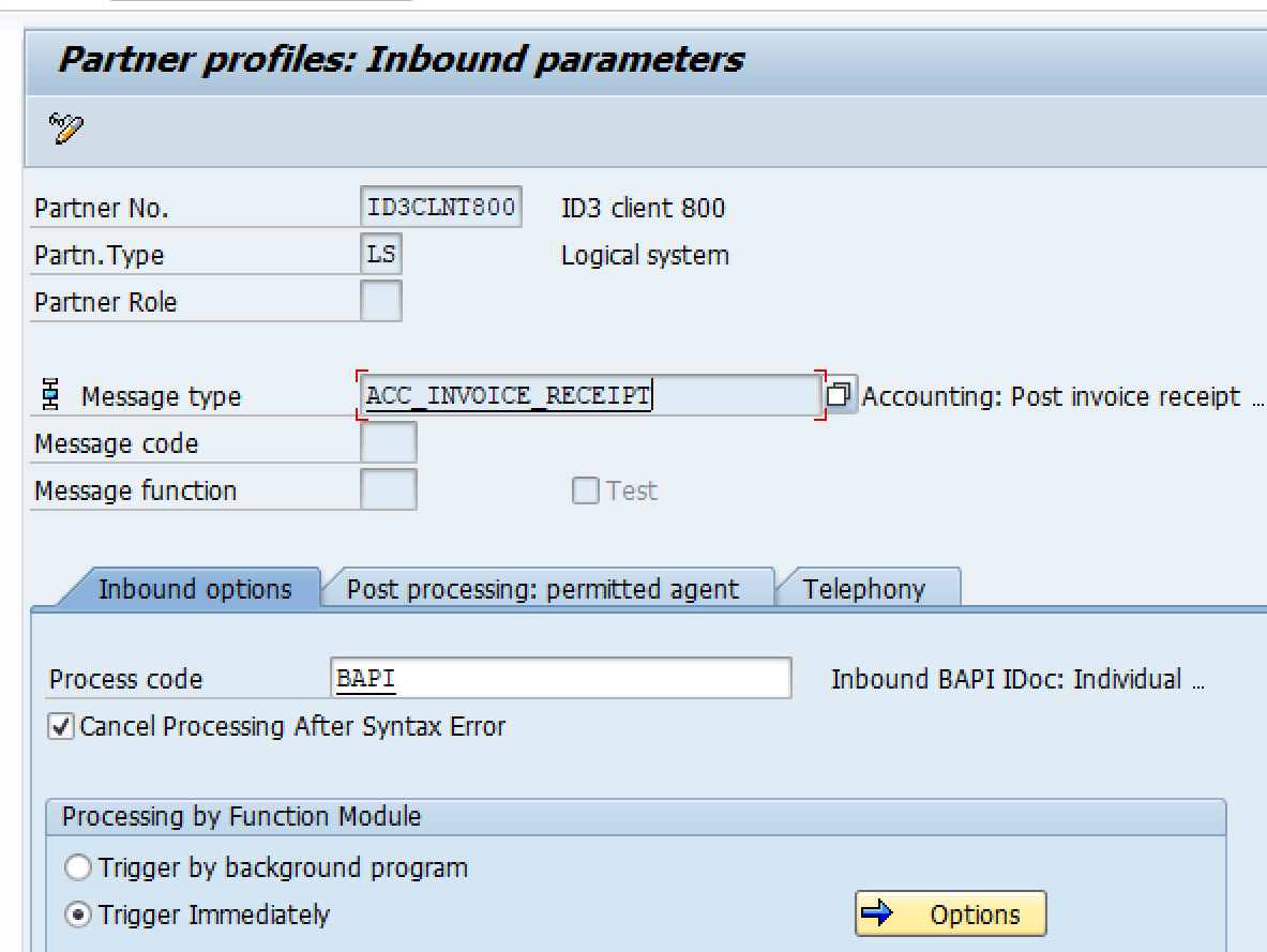 This has to be configured separately for different iDoc types. Here we will set it up for inbound iDoc type ACC_INVOICE_RECEIPT03 (Post Vendor Invoice)