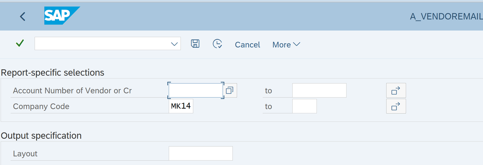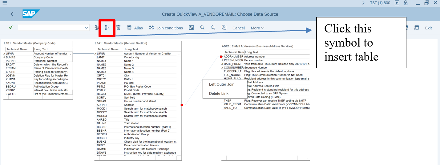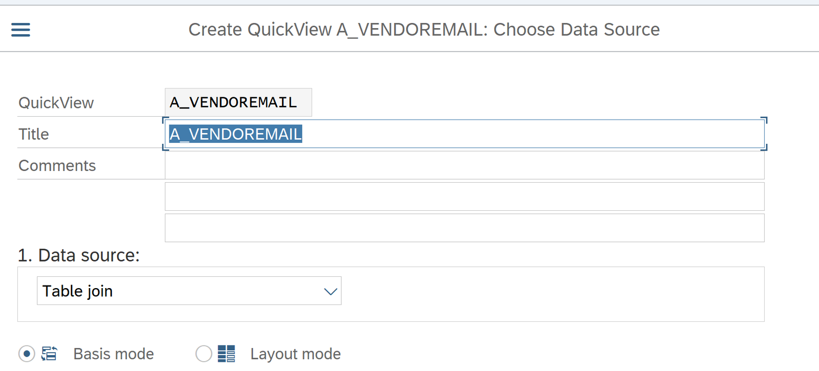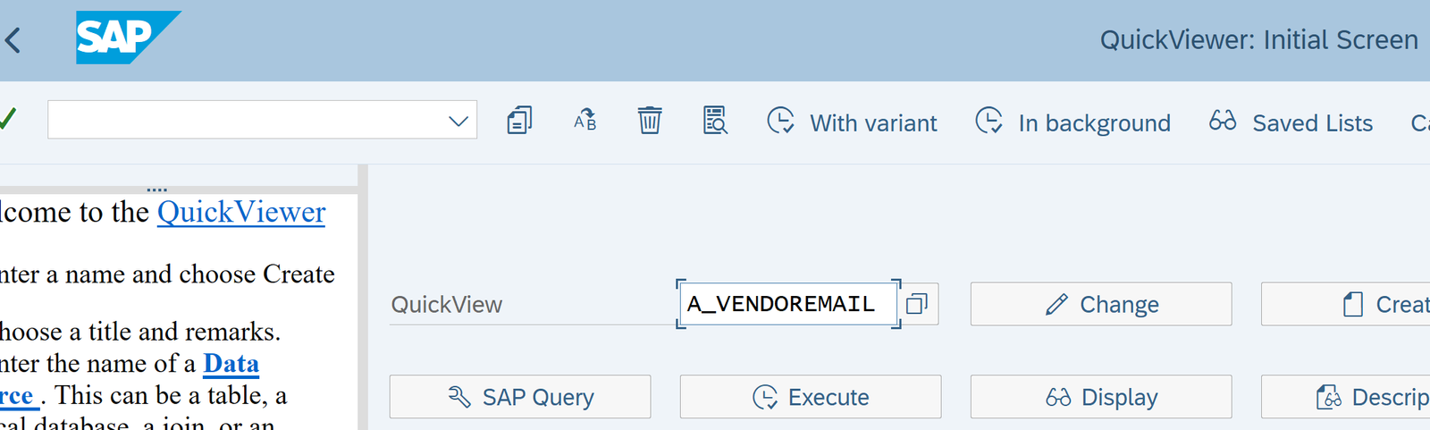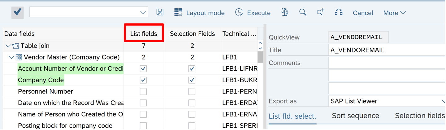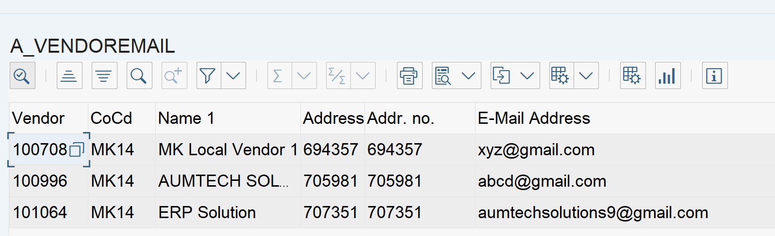 Create Query in SQVI to get vendor ID with email address. We will use table LFB1, LFA1 and ADR6 table combination to get vendor email, Vendor Number, Vendor name, Company code. Use Left Outer join between LFA1 and ADR6 table to get all vendors with email address.