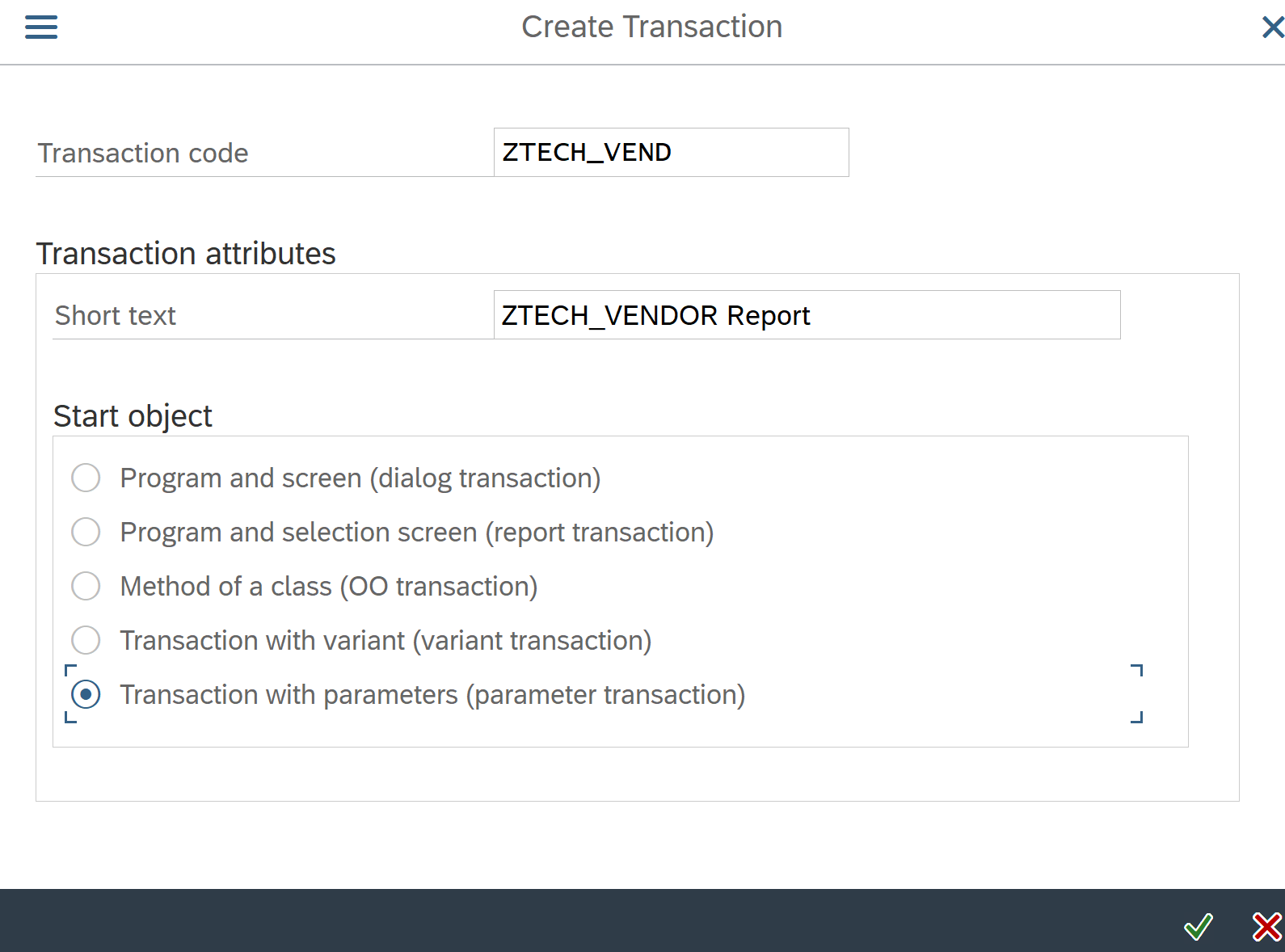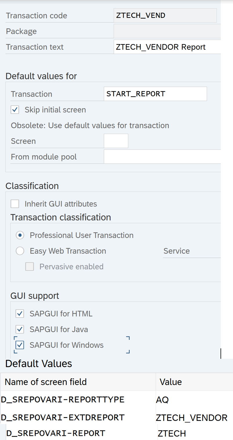 Click Save button. This will create transaction code for the above query. In this example transaction code ZTECH_VEND has been created for this query