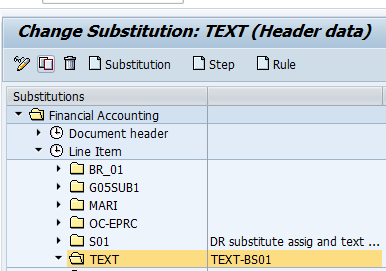 Press Substitution button, enter the substitution name in substitution field, press enter, then the ‘TEXT’ is listed under node ‘line items’ in the left Substitutions area as follow: