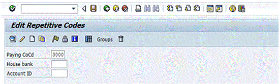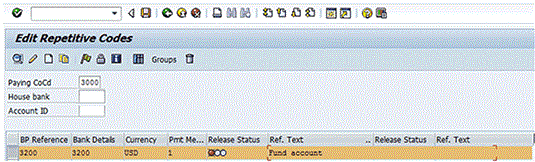Both bank-to-bank repetitive code and business partner repetitive code templates are created using the Edit Repetitive Codes program (transaction code OT81). After you execute transaction code OT81 or follow menu path Accounting > Financial Accounting > Banks > Master Data > Repetitive codes > Repetitive Codes, the Edit Repetitive Codes screen appears (Figure 1). To create the repetitive code template, enter a value for the sending company code in the Paying CoCd (paying company code) field and enter the name of the house bank in the House bank field.