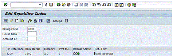 Before you can execute a bank-to-bank repetitive code or business partner payment, you need to create a repetitive code template. The repetitive code template defines details of the payment that will be executed. The two aspects of the payment that are not included in the repetitive code template are the amount and the value date.