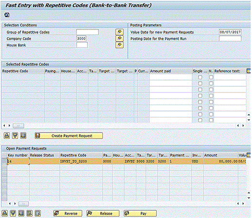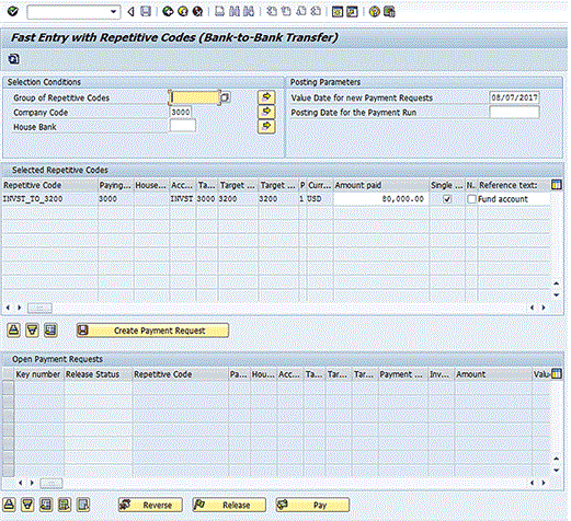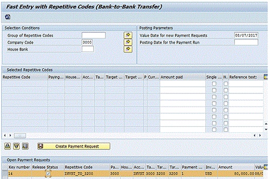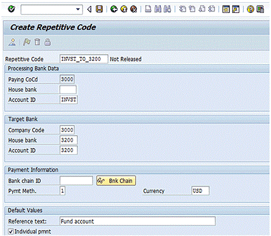 The most common type of repetitive payment is the bank-to-bank transfer. Bank-to-bank transfers are used to make repetitive payments from one house bank account to another. Both accounts must be defined in the SAP system as house bank accounts. Keep in mind that when the two accounts are in different company codes, this type of repetitive payment creates an intercompany posting document (the payment posting posts to the intercompany due to /due from accounts) posting. (Bank-to-bank transfers can be done between any two accounts as long as the FI configuration has enabled cross-company code postings between the two entities.)