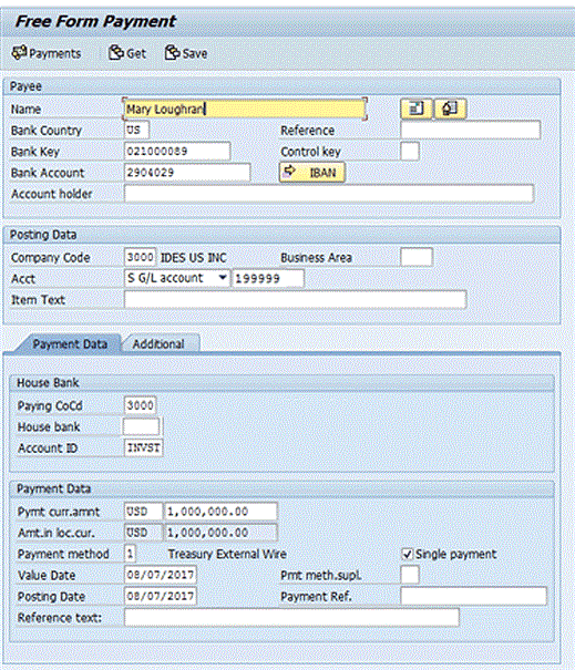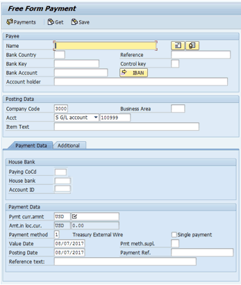 A treasury department needs to be able to make urgent payments on an as-needed basis. The SAP system provides this functionality with the free form payments transaction. Treasury staff can make payments from any bank account in any company code configured in the system to any external bank account. These payments, including the bank details, are keyed in manually by a treasury user.