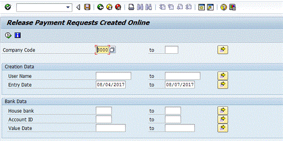Before a free form payment can be paid, a user with the authorization to release free form payments must release it. Approving the free form payment at this point is critical because the bank account details have been entered manually into the SAP system. To release the free form payment, execute transaction code F8REL. (This transaction code is not in the SAP menu.) This action opens the screen in Figure 16.