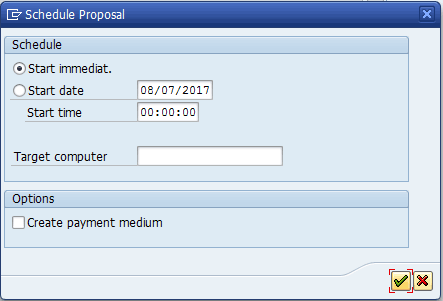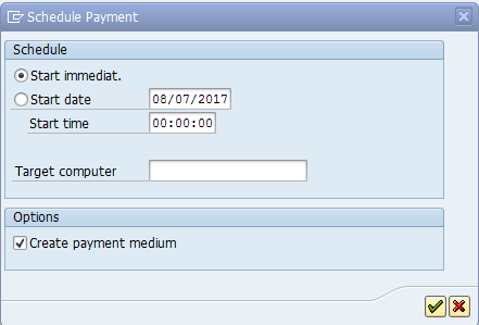 Treasury payment programScheduled or manually executed (F111)The payment accounting documents are created in this step, but the payment file is not created. The payment file is not created until the payment processing and approval are successfully completed.