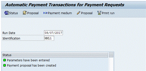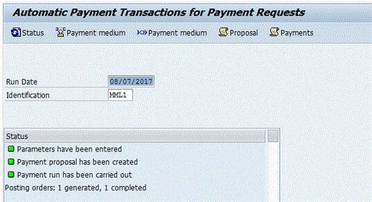 After the payment run is complete, the payment program screen should look like the screen in Figure 28. Note that this screen includes a message indicating that the payment run has been carried out (successfully). At this point, the payment request has been cleared, the posting for the payment has been made to the SAP General Ledger, and assuming the payments have not been routing to the SAP Bank Communication Management module, the payment file has been created.