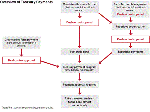 The diagram in Figure 29 summarizes the different types of payments that are made through the Treasury payment program and shows where bank account information can be entered (in blue) and where dual controls can be put (in red).
