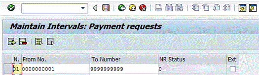 Next, define a number range for the payment request. Payment request numbers, also known as key numbers, go across company codes, meaning each payment request is given a unique number regardless of the company code from which the payment was made. To define the payment request number range, follow IMG menu path Financial Accounting > Bank Accounting > Business Transactions > Payment Transactions > Payment Request > Define Number Ranges for Payment Requests. Click the Change intervals button (not shown). Click the insert line icon