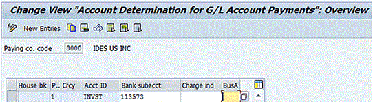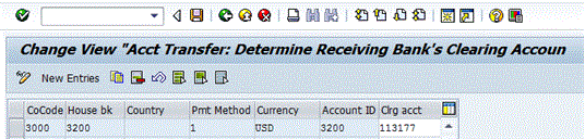 Next, the account determination for the Treasury payment program is entered. This configuration can be done by currency, house bank account, and /or payment method. In this step, you define when the Treasury payment program is run in this currency, the house bank account, the payment method, and the cash clearing account to which the posting from the payment request clearing account should go. In other words, the payment program uses this table to determine the accounting entries to make when the program is run. Follow IMG menu path Financial Accounting > Bank Accounting > Business Transactions > Payment Transactions > Payment Handling > Bank clearing account determination >