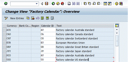 A calendar must be defined to determine working days for each currency you will be paying out of the Treasury payment program. This is done using IMG menu path Financial Accounting > Bank Accounting > Business Transactions > Payment Transactions > Payment Handling > Value Date > Define Factory Calendar per Currency, as shown in Figure 39. Make sure there is a calendar specified for all currencies that will be paid using the Treasury payment program.