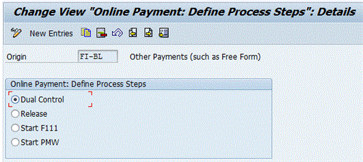 The last configuration step is to set dual control on free form payments (origin FI-BL). Do this by using the IMG menu path Financial Accounting > Bank Accounting > Business Transactions > Payment Transactions > Online Payments > Define Process Steps, as shown in Figure 40. Select the Dual Control radio button for the origin FI-BL, then click the save icon.