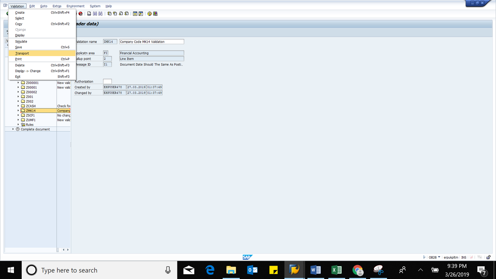 Now to Transport the Validation from SAP Development system to SAP Quality system, select the validation. Click Validation button -> Click Transport and save the Validation.